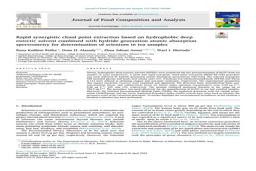 نشرت التدريسية في قسم صحة الغذاء والتغذية في كلية علوم الاغذية م.رنا كاظم رضا بحث علمي بعنوان استخلاص نقطة الغيمة بأستخدام مذيبات عميقة الهيدروفوبية بالازدواج مع مطيافية الامتصاص الذري الكرافيتي الهدريدي لتقدير السيلينيوم في عينات الشاي تناول البحث استعمال مذيبات عميقة الهيدروفوبية (HDESs) لتقدير السلينيوم(IV) في عينات الشاي وبدرجة حرارة الغرفة باستخدام تقنية استخلاص نقطة الغيمةCPE) ) تتبعها تقنية مطيافيـة الامتصاص الذري الكرافيتي الهدريدي((GH AAS حيث ان DES تتضمن الكلايسين وحامض اللوريك بنسبة (molar ratio 3:1). وبوجود المادة النشطة سطحياً TritonX-114)) اللاايونية وباستعمال الكاشف العضوي (HTAB) 2-hydroxy-5-p-tolylazobenzaldehyde)) وقد كان حد الكشف للسلينيوم(IV) على التوالي 0.02 μg L -1,0.06 μg L-1, 125, and 149 وكان مقدار خطية منحنـــــــي المعايــــــــــرة بحــــــــــدود 0.05–700) μg L -1) و أظهرت هذه الطريقة نجاحاً في تقدير السيلينيوم (IV)في عينات الشاي الأخضر والأسود وتعد من الطرق الصديقة للبيئة وتحت قائمة الكيمياء الخضراء.