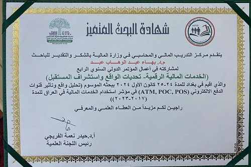 شارك التدريسي في قسم الإنتاج الحيواني الدكتور بهاء عبد الوهاب في المؤتمر العلمي الدولي السنوي الرابع المنعقد في وزارة المالية / مركز التدريب المالي والمحاسبي ببحثه العلمي الموسوم ( تحليل واقع وخدمات الدفع الالكتروني في مؤشر استخدام الخدمات المالية في العراق ) والذي فاز من ضمن البحوث المتميزة من بين اكثر من 90 بحث تقدم به باحثين من العراق ومصر والاردن والجزائر والامارات ويهدف البحث الى سعي الحكومة العراقية بالتعاون مع البنك المركزي العراقي لزيادة استخدام واعداد قنوات الدفع الالكتروني من اجل التخلص من التعامل النقدي وبشكل تدريجي والسرعة في انجاز التعاملات المالية والمصرفية فضلاً عن تقليل حالات الفساد في التعاملات المصرفية والمالية, لذلك هدف البحث الى معرفة المعوقات التي تواجه استخدام قنوات الدفع الالكتروني والدعم المقدم لها من قبل الحكومة في العراق وتحليل واقع قنوات الدفع الالكتروني (ATM,POC,POS) وقياس أثرها في البطاقات المصرفية والحسابات المصرفية. وقد أفرزت نتائج البحث بما يتوافق مع فرضية واهداف البحث هو محدودية اعداد وانتشار قنوات الدفع الالكتروني (ATM, POC, POS) في العراق, فضلاً عن ضعف الانتشار والوعي التكنلوجي والتثقيف حول التعامل معها, وهذا كله مع مشروع توطين الرواتب الذي اجبر على المواطنين في زيادة البطاقات المصرفية والحسابات المصرفية انعكس في أن يكون لتلك القنوات آثار لكنها محدودة ومتباينة في زيادة البطاقات المصرفية والحسابات المصرفية, إلا إن عام 2023 يعتبر الأفضل مقارنة بالأعوام السابقة. ويستمد البحث أهميته من سعي الحكومة العراقية بالتعاون مع البنك المركزي العراقي لزيادة استخدام واعداد قنوات الدفع الالكتروني (ATM, POC, POS) من اجل التخلص من التعامل النقدي وبشكل تدريجي والسرعة في انجاز التعاملات المالية والمصرفية فضلاً عن تقليل حالات الفساد في التعاملات المصرفية والمالية. لذلك يستمد البحث اهميته من دراسة واقع قنوات الدفع الالكتروني وانعكاسها على استخدام الخدمات المالية المتمثلة (البطاقة المصرفية، والحسابات المصرفية) خلال مدة البحث .