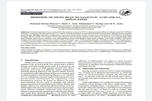 نشر التدريسي في كلية الزراعة بجامعة القاسم الخضراء م.محمد يوسف مرهج بحثا علميا في مجلة علمية لتحديد تأثير حمض الساليكفلويك 50 و 100 و 150 ملغ 1 و GA 30 و 60 و 90 ملغ 1 و معالجة التحكم في نمو ونتاج فول مونغ تضمن البحث استخدام تصميم عشادي كامل الكتلة (RCBD) مع ثلاثة نسخ من خلال زراعة بذور النوع المحلي في على جانبي التلال 80 سم على بعد 15 سم. وأظهرت النتائج أن رش حمض الساليسيليك الذي يعد هرمون ذاتي الطبيعة الفينولية يلعب دورا دفاعيا ضد الإجهاد اللأحيائي من خلال تنظيم بعض العمليات الفسيولوجية في النبات مثل التمثيل الضوئي والإزهار (Hayat et al (2010)1 وهو جزيء إشارة طبيعية داخلية تشارك في آليات الحفظ من خلال تنظيم بعض العمليات الكيميائية الحيوية. وهو يعمل في الدفاع عن الضغوط البيئية الجسدية مثل الجفاف والملوحة وجرعات حمض الغلوكوز والتي تعطي ارتفاعاً كبيراً للنبات ورقم أوراق النبات ومحتوى ورقة الكلوروفيل وطول القرينة وعدد قرون النبات ورقم بذور القرينة وان استخدام جيبريلين GA لزيادة طول الزهور النباتية يؤدي إلى تعزيز الإزهار المبكر لنمو النبات ومنطقة الأوراق ويمنع الزهرة والإجهاض البسيط للفواكه [Kadim et al. (2021)1) كما وان إضافة الجبريلين يمكن أن يحسن من خصائص نمو النبات والفواكه، فضلا عن زيادة مقاومة النبات للظروف البيئية السلبية