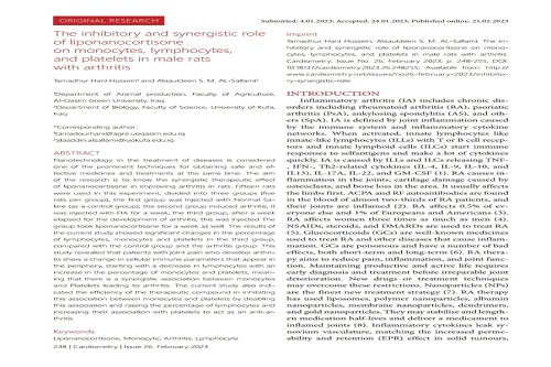 في اطار السعي لتقديم الخدمات العلمية نشرت التدريسية م. تماضر هاني حسين بحثاً علمياً في مجلة Cardiometry بعنوان The inhibitory and synergistic role of liponanocortisone on monocytes, lymphocytes, and platelets in male rats with arthritis تهدف الدراسة الى التعرف على علاج التهاب المفاصل لازالة آلام والتهاب المفاصل مع تعزيز أو الحفاظ على وظيفة المفصل في نفس الوقت ويتم تحقيق ذلك من خلال تحليل عدد من العوامل الدموية مثل الخلايا الليمفاوية وحيدات والصفائح الدموية تناول البحث معرفة التأثير العلاجي التآزري لليبونانوكورتيزون في تحسين التهاب المفاصل في الجرذان. أظهرت نتائج الدراسة الحالية تغيرات معنوية في نسبة الخلايا الليمفاوية والوحيدات والصفائح الدموية وكشفت أن الفئران التي تعاني من آلام المفاصل والتي تصاب بالتهاب المفاصل تظهر تغيرًا في معايير المناعة الخلوية التي تظهر في المحيط ، بدءًا من انخفاض الخلايا الليمفاوية مع زيادة النسبة المئوية للخلايا الأحادية والصفائح الدموية ، مما يعني أن هناك ارتباطًا تآزريًا بين الخلايا الوحيدة والصفائح الدموية مما يؤدي إلى التهاب المفاصل. وكذلك اظهرت كفاءة المركب العلاجي في تثبيط هذا الارتباط بين الخلايا الوحيدة والصفائح الدموية عن طريق تعطيل هذا الارتباط ورفع نسبة الخلايا الليمفاوية وزيادة ارتباطها بالصفائح الدموية لتعمل كمضاد لالتهاب التهاب المفاصل.